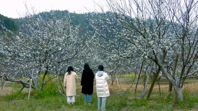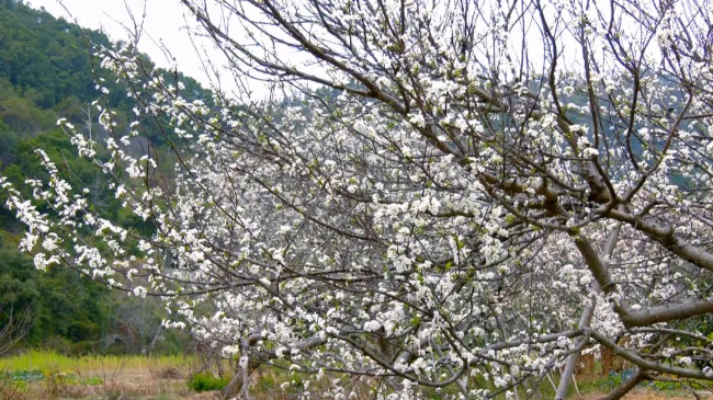 在国道358线三华路段沿线两边,成片的三华李树如雪覆盖,洁白的李花肆意绽放在山间田野,与周围错落有致的农舍、蜿蜒的乡间小路、远处朦胧的青山相映成趣,共同构成了一幅充满诗意与田园风情的美丽乡村画卷。