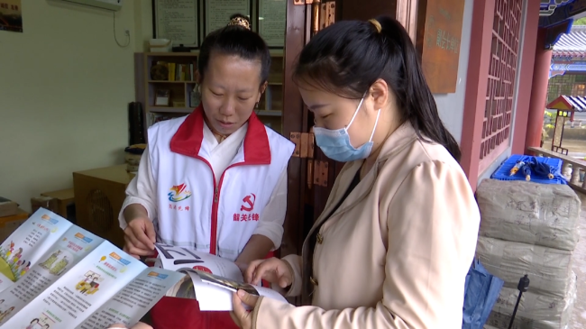 在旅游问询处,东华山风景区的工作人员化身志愿者向前来避雨或咨询的游客发放宣传资料,并引导游客到电子屏幕前了解景区管理制度和需要遵守的文明规范及文明礼仪,帮助游客树立文明旅游观念,营造安全出行、文明游玩的良好氛围。