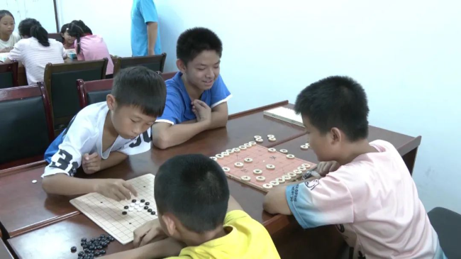 记者在坝仔镇岩庄社区看到,桌面上摆放着跳棋、军棋、五子棋、象棋等棋盘,孩子们两两一组,正认真伏案下棋,时而深思、执棋不语,时而落棋迅速、胸有成竹。社工老师们在一旁细心讲解行棋规则、传授布局、破局技巧。一举一落间,小朋友们着棋逐渐成熟,大家互相交流探讨棋艺,玩得不亦乐乎。