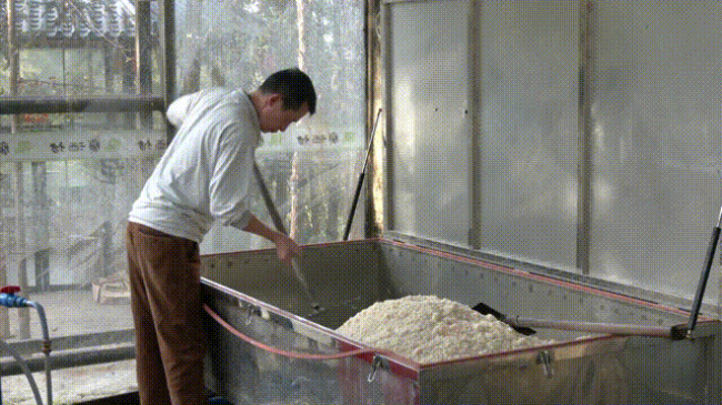 近日,记者来到梅兰谷风景区看到,坐落在景区内的陈酿酒厂文化公园依山而建,作坊、长廊立于林间,环境清幽。酒厂内工人正在摊凉胚芽米。