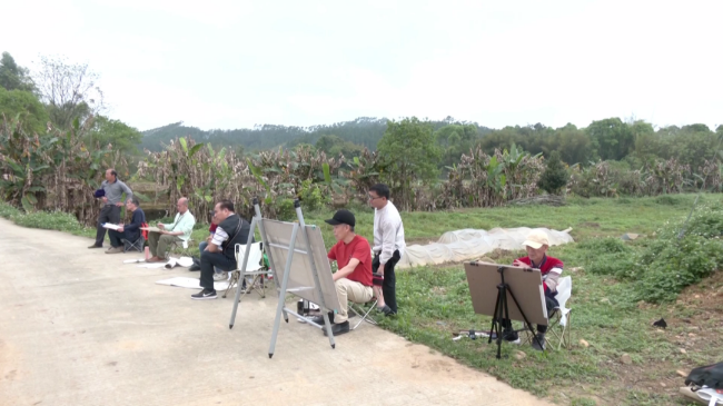 在翁城镇大腊岭山脚下,艺术家们或三五成群,或独自一人,以当地自然风光、人文美景为题材,用心感受每一处细微的景致的同时,在纸上轻轻勾勒线条,将自己的体会和感悟通过画笔呈现在画布上。