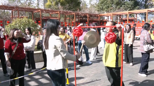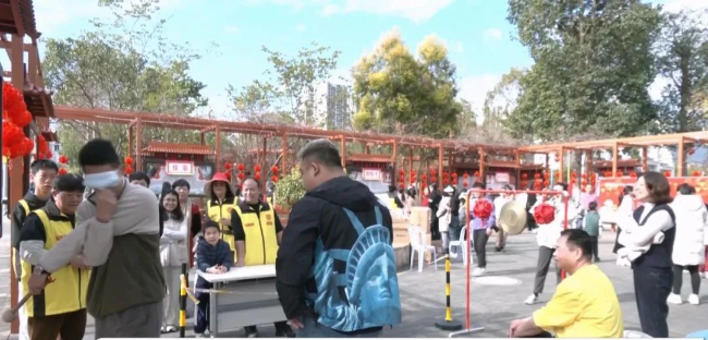 敲铜锣游戏区同样也是一片欢声笑语,大家纷纷给转圈后迷失方向的“蒙眼人”指引方向,为其加油鼓劲,同时,大家也在观摩中寻找诀窍,力求一击即中,敲出清脆的锣声。