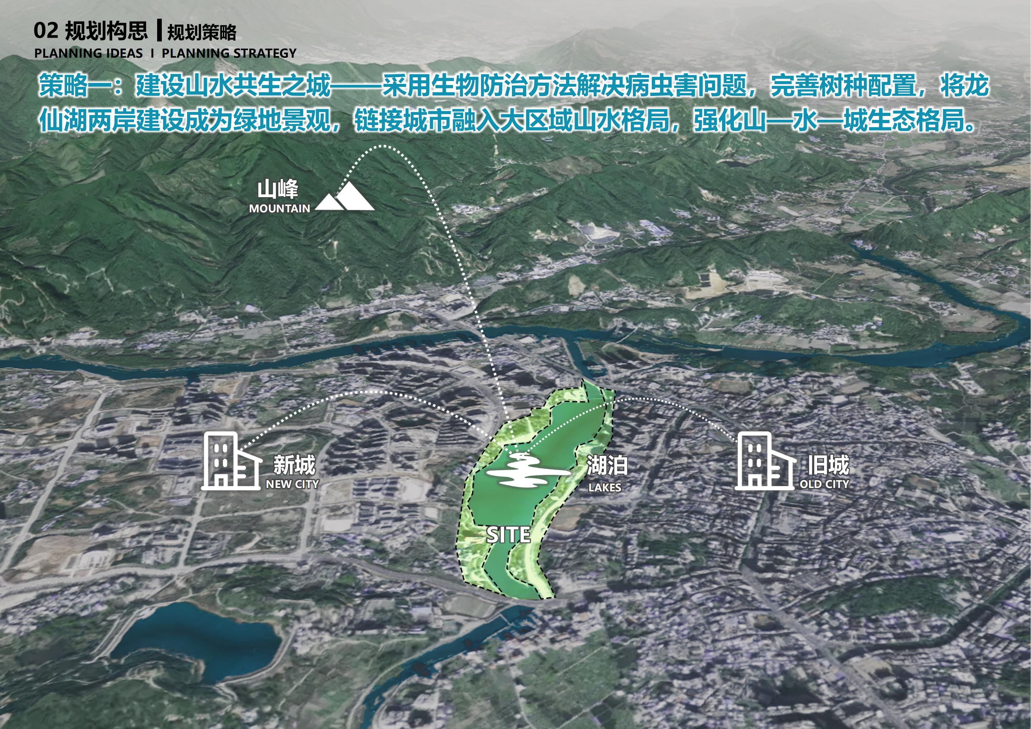 策略一:建设山水共生之城。完善树种配置,将龙仙湖两岸建设成为绿地景观,衔接城市融入大区域山水格局强化山-水-城生态格局。