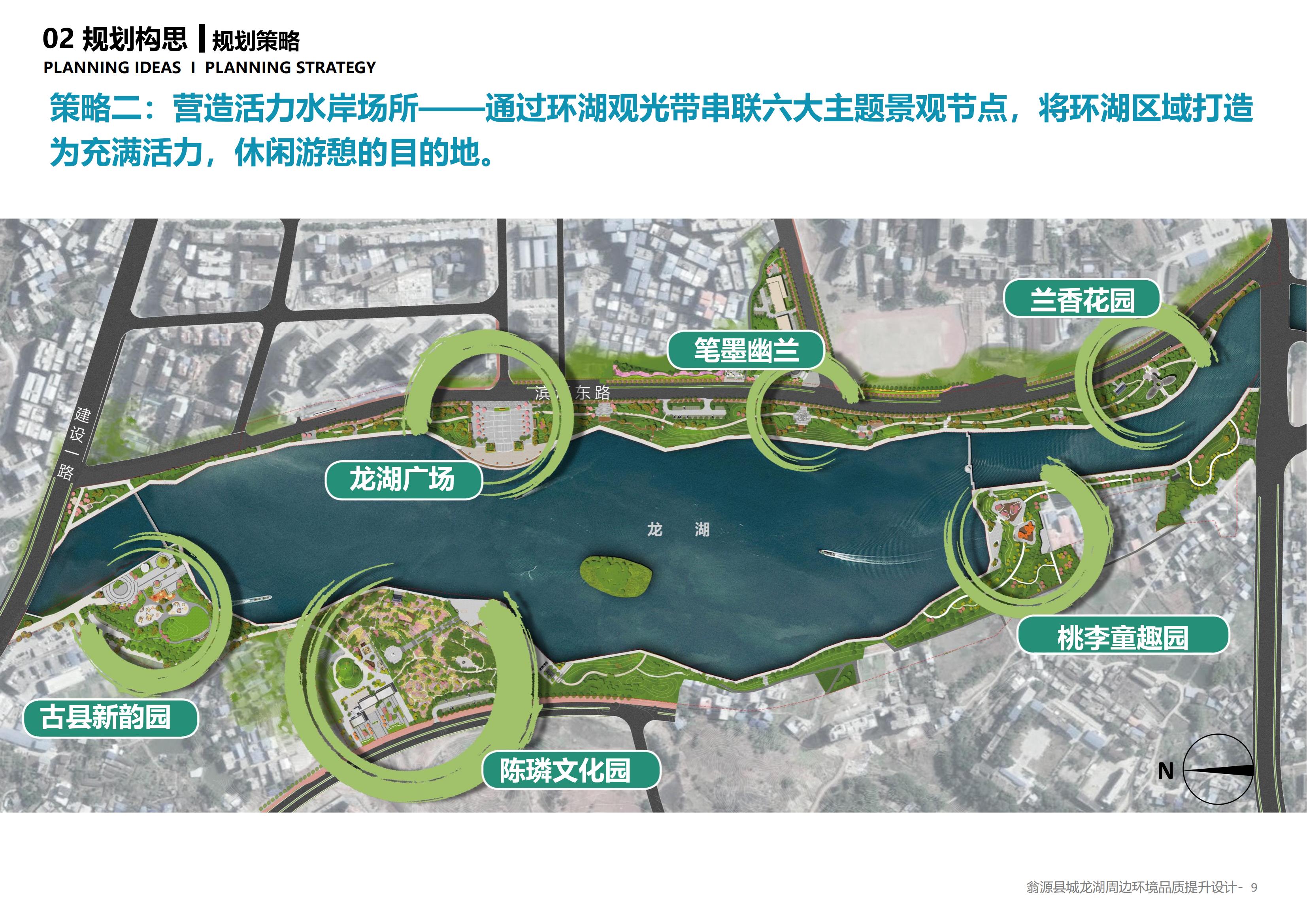 策略二:营造活力水岸场所。通过环湖景观带串联六大主题景观节点,将环湖区域打造为充满活力,休闲游憩的目的地。