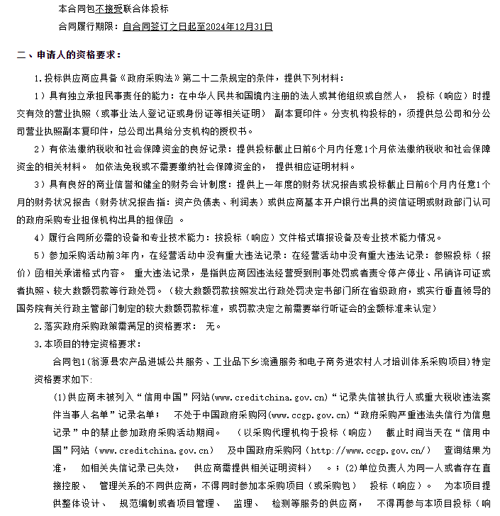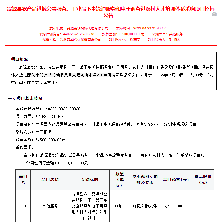 【2020年国家】翁源县农产品进城公共服务、工业品下乡流通服务和电子商务进农村人才培训体系采购项目招标公告