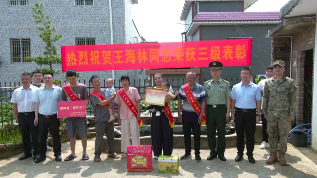 6月10日上午,县委常委、县人武部政治委员滕召林,县退役军人事务局及江尾镇有关负责同志率队来到江尾镇九仙村,为荣获三级表彰的现役军人王海林家属送上立功喜报,传达党和政府的关心慰问。
