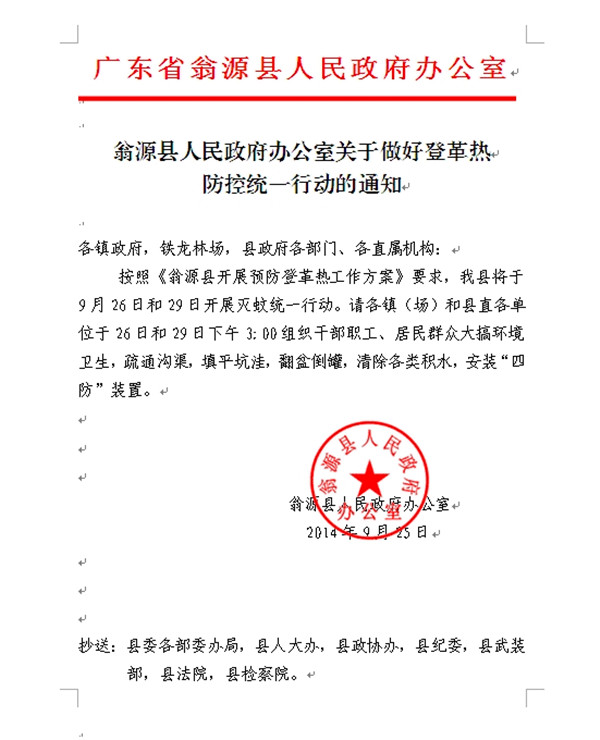 翁源县人民政府办公室关于做好登革热防控统一行动的通知