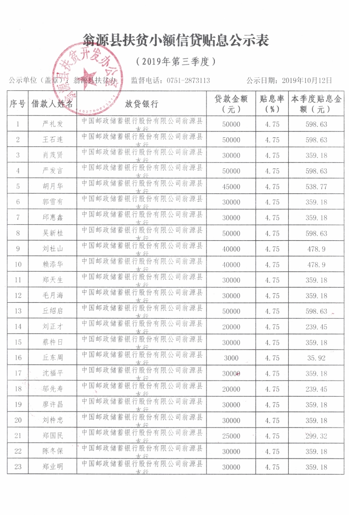 邮储银行翁源支行206户建档立卡贫困户小额信贷2019年第三季度贴息