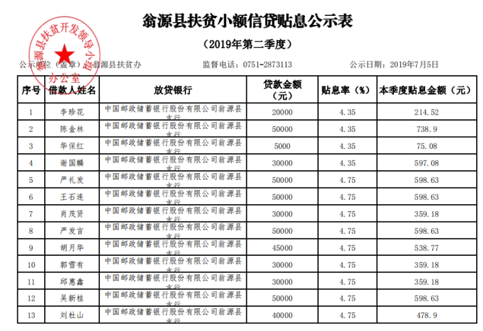 邮储银行翁源支行137户建档立卡贫困户小额信贷2019年第二季度贴息