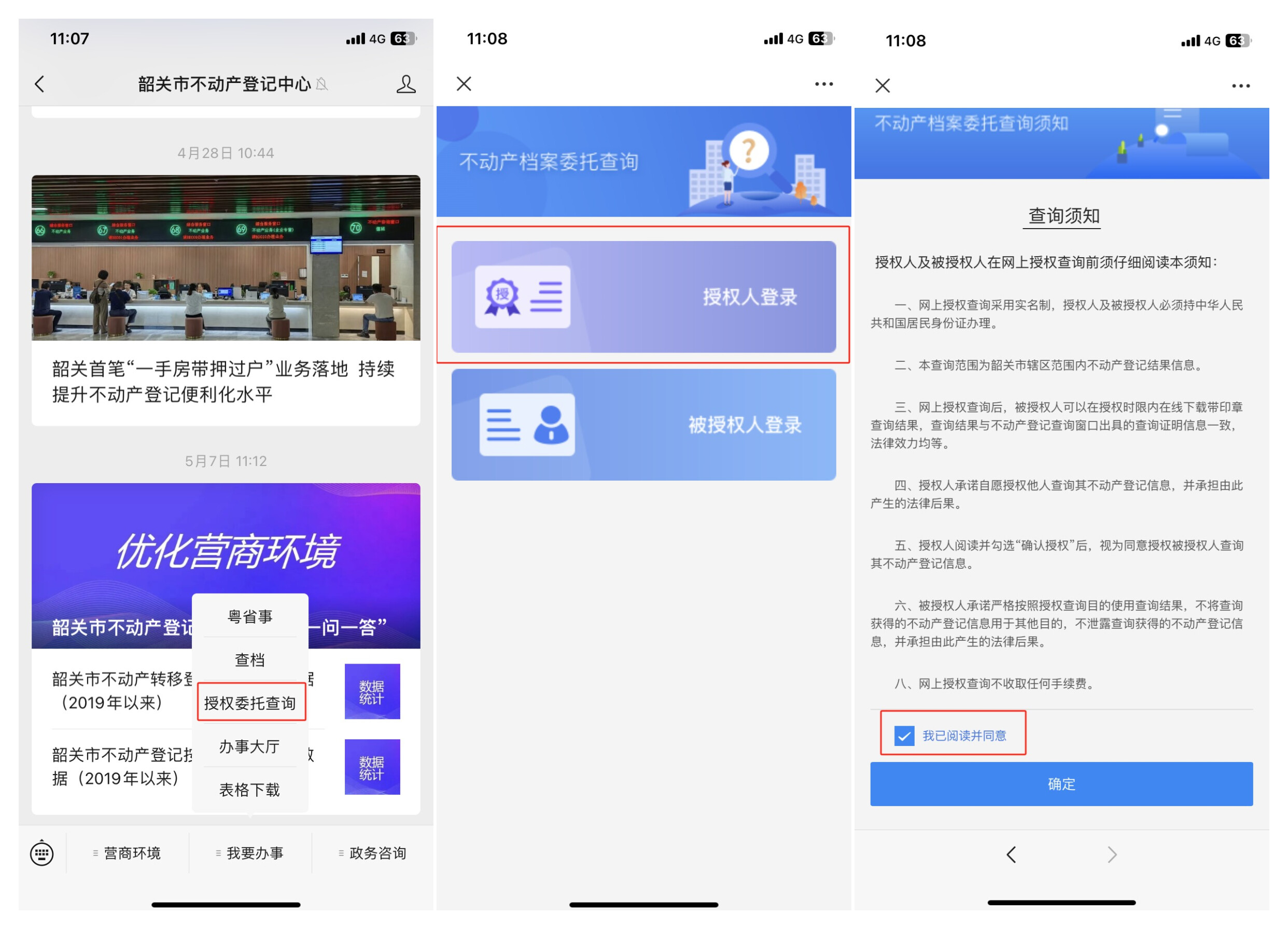 1.关注【韶关市不动产登记中心】微信公众号后,在公众号界面点击下方【我要办事】,选择【授权取委托查询】,进入页面后选择【授权人登录】并确定【查询须知】。