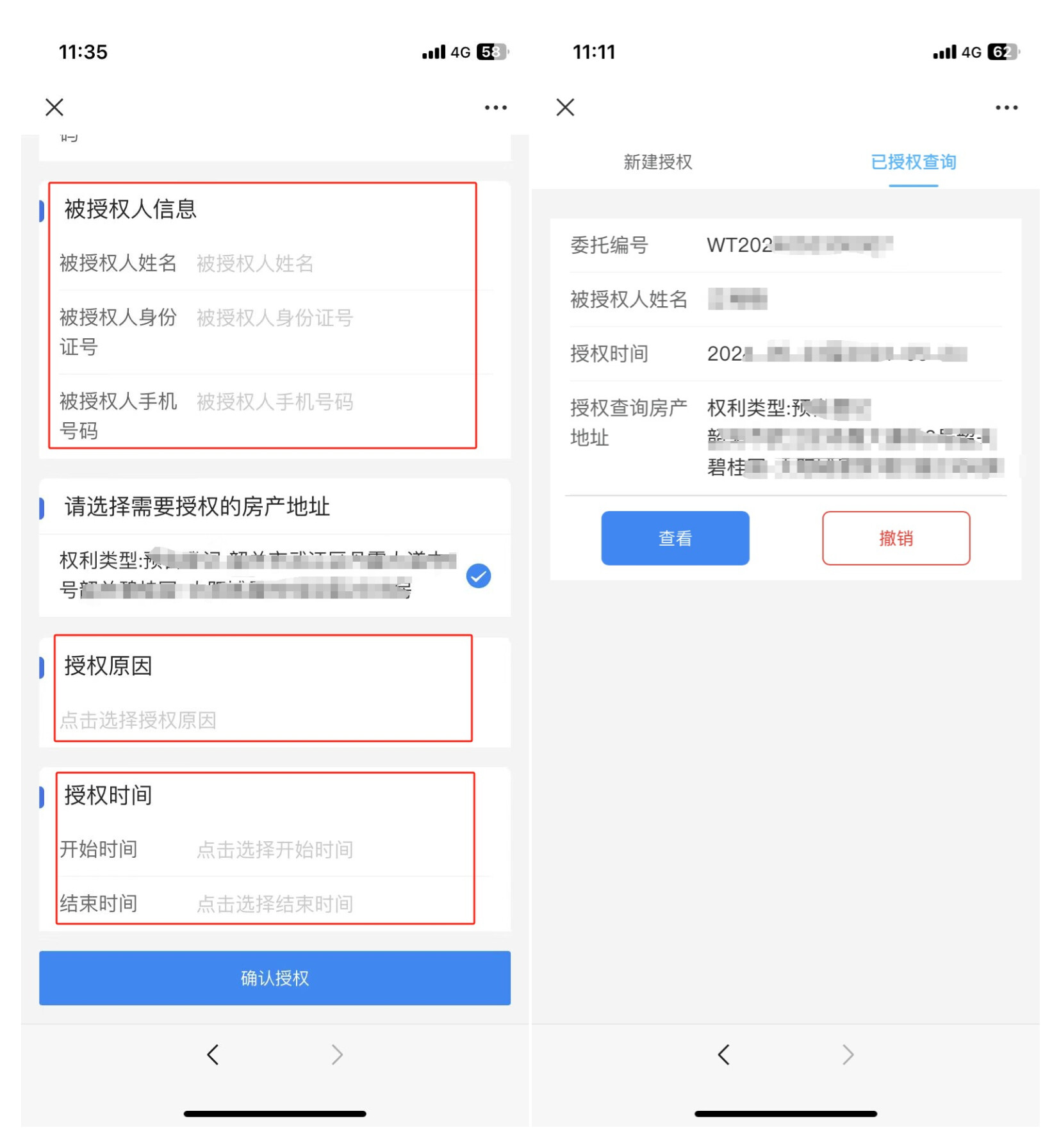 3.进入授权页面,填写被授权人信息,选择所要授权的不动产,填写授权原因和选定授权时间后可查看不动产授权情况和撤回授权记录。
