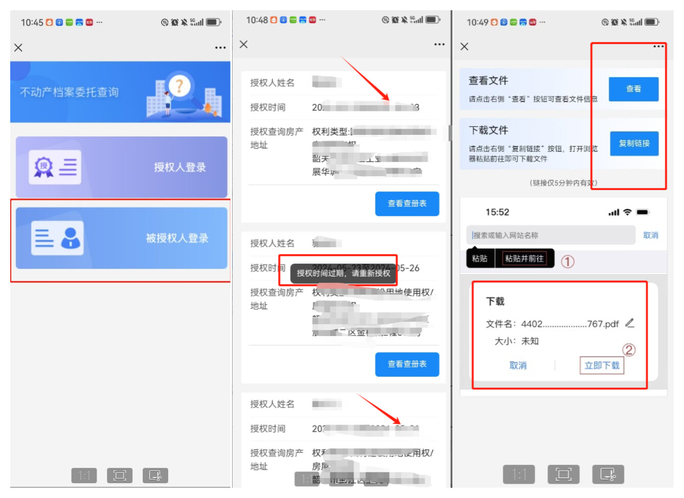 产权人授权后,被授权人进入“韶关市不动产登记中心”微信公众号,在公众号界面点击下方【我要办事】,选择【授权取委托查询】,进入页面后选择【被授权人登录】,确定【查询须知】和通过人脸识别后即可查看被授权记录,点击【查看查册表】可查看授权时间内的查档报告。其中点击【查看】可在线浏览报告,点击可【复制链接】下载报告。