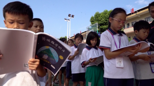 首发仪式上,翁城镇中心小学的近2000名学生每人手捧一本《翁城孩子的诗》,在来自羊城晚报艺术研究院的王绮彤老师带领下,齐声朗读书中的代表作《1号粮仓的秘密》。