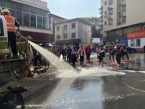 群众参与,奏响美丽家园“合奏曲”。清洁行动坚持“全覆盖、见底色、常态化”保洁要求,合理调配人力物力,采取“扫、冲、洗、保”的组合作业法和“机械+人工”联合作业措施,对镇街主次干道、市政设施进行深度清洁。发动群众及干部职工对路边的灰尘、果皮碎屑进行清扫,出动洒水车、消防车对道路砂石、路面油渍等进行冲洗作业,并对冲洗后的果皮箱、景观盆等进行人工擦洗。在干群协力合作下,无论是路面的灰尘积痕还是藏匿于角落的顽固垃圾均被一一清除。活动过程中,镇干部职工还向居民宣传共同维护环境卫生整洁干净,进一步增强居民的环保意识和社区责任感。