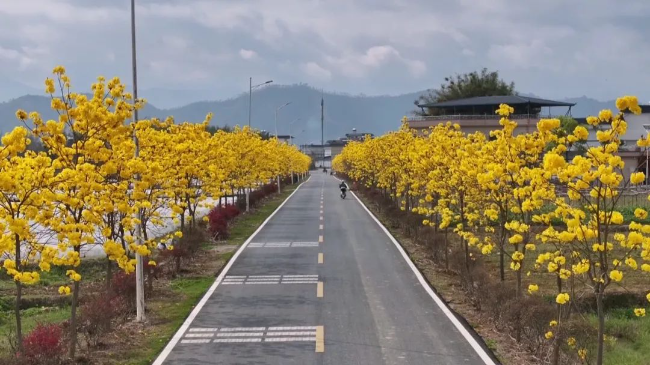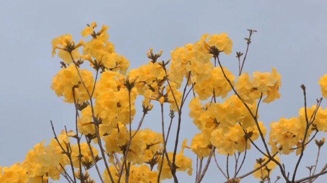 3月13日,记者来到347县道周陂镇石陂头路段看到,道路两侧绵延的黄花风铃木像是两条金色绸带,沿着县道徐徐铺展,满树金黄的花朵,宛如披上了一袭璀璨的“黄金甲”。黄花风铃木的花姿别具一格,硕大的花穗一串串垂挂枝头,满树尽是金黄,不见一片绿叶。