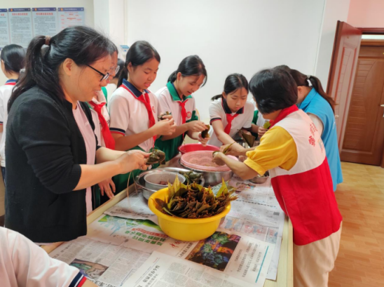 在包粽子环节,孩子们在经验丰富的家长、老师的指导下逐步掌握包粽子的方法,从折粽叶、填糯米、放馅料,到扎绳子,孩子们几番尝试,很快,一个个形态各异的粽子便制作完成了。