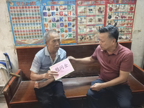 在老党员甘仁贵家中,林有成与甘仁贵亲切交流,耐心询问他的身体状况、子女就业等情况,并送上慰问金。