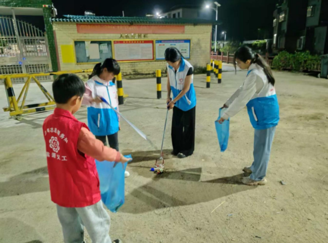 在坝仔镇岩庄河两岸街道,青少年们化身“护河特工队”,沿着街道徒步拾捡垃圾。他们手拿垃圾夹与垃圾袋,俯身认真搜寻河道周边的每一处角落。将隐匿在草丛深处的废弃饮料瓶、河岸边被遗忘的包装袋,清理干净。